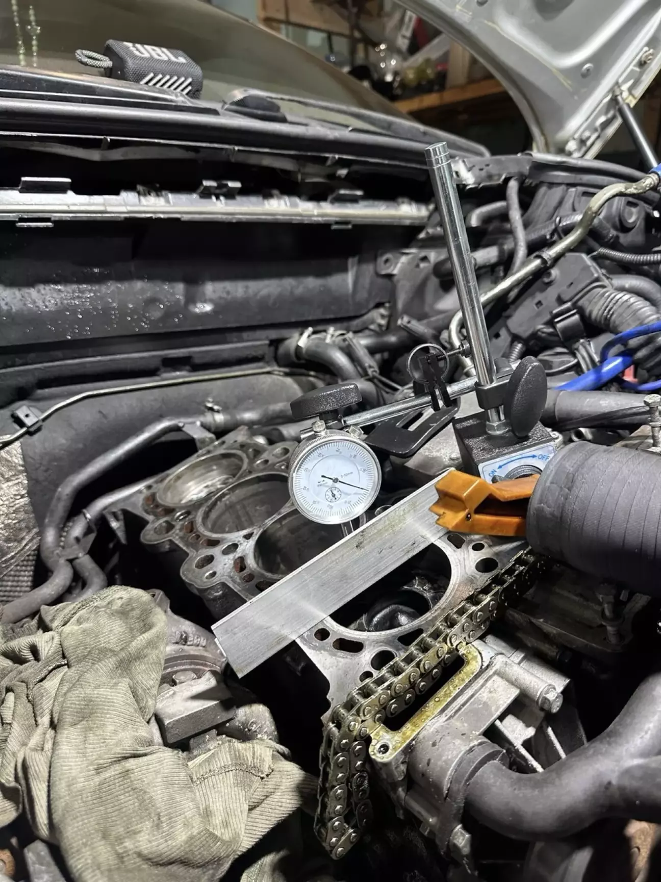 А поки ми чекаємо, паралельно задаюся питанням. Чого у машини стоїть прокладка ГБЦ на три отвори. Зазвичай, після багатьох ремонтів таке може бути. + токарі кажуть, що на голові ще заводська риска, її ще не чіпали. Заліз в інтернет і вирішив собі індикатор часового типу з магнітною підставкою, щоб перевірити виліт поршня з блоку.