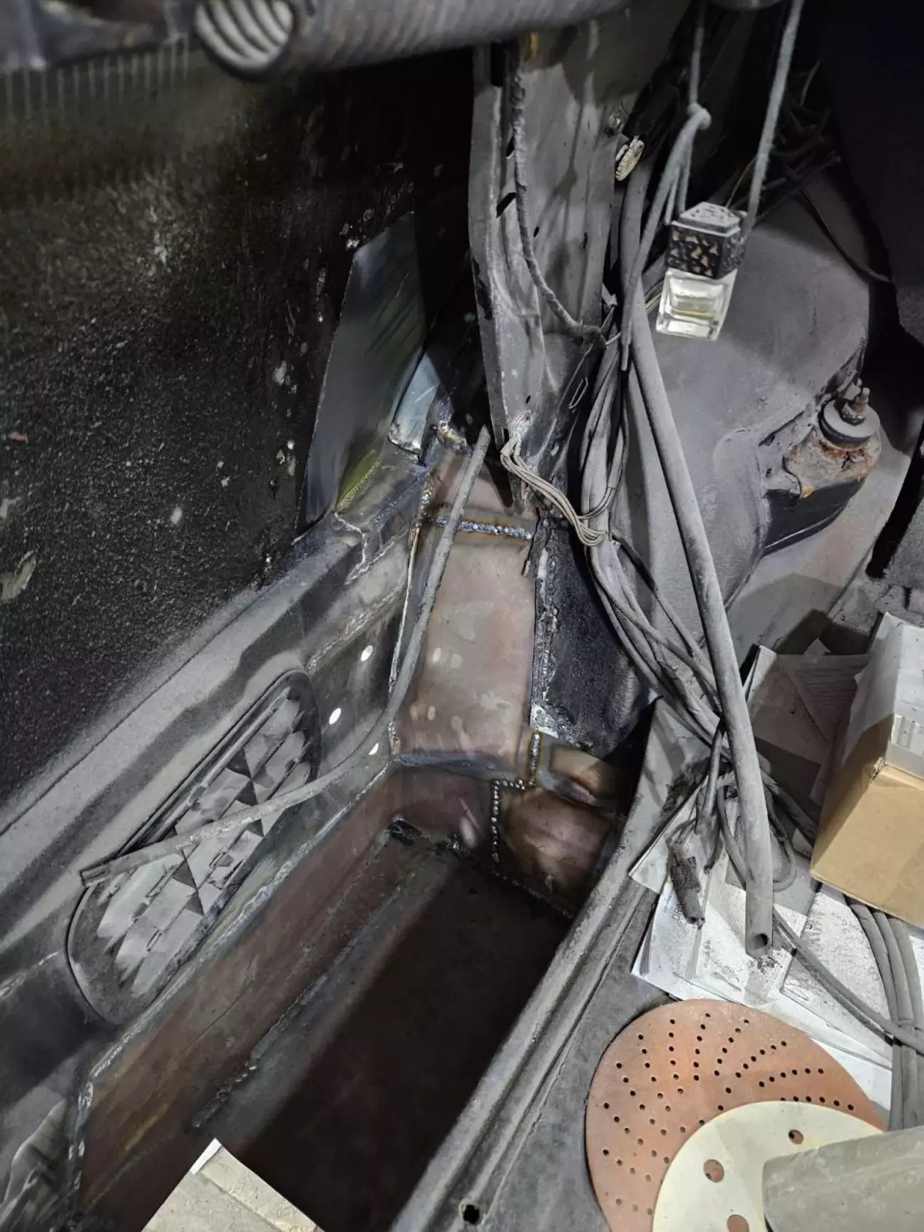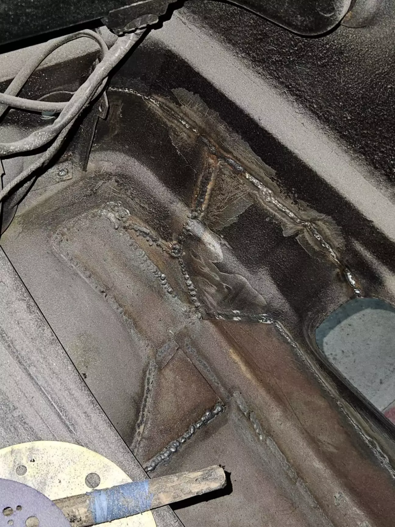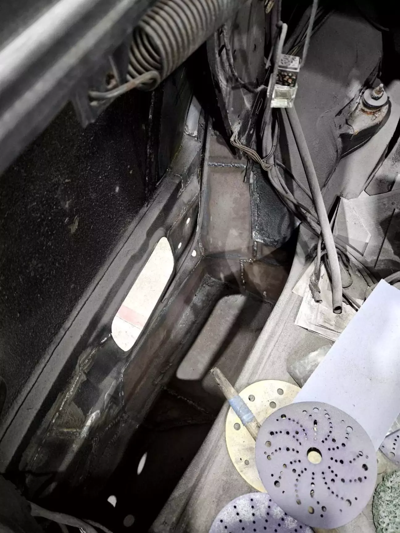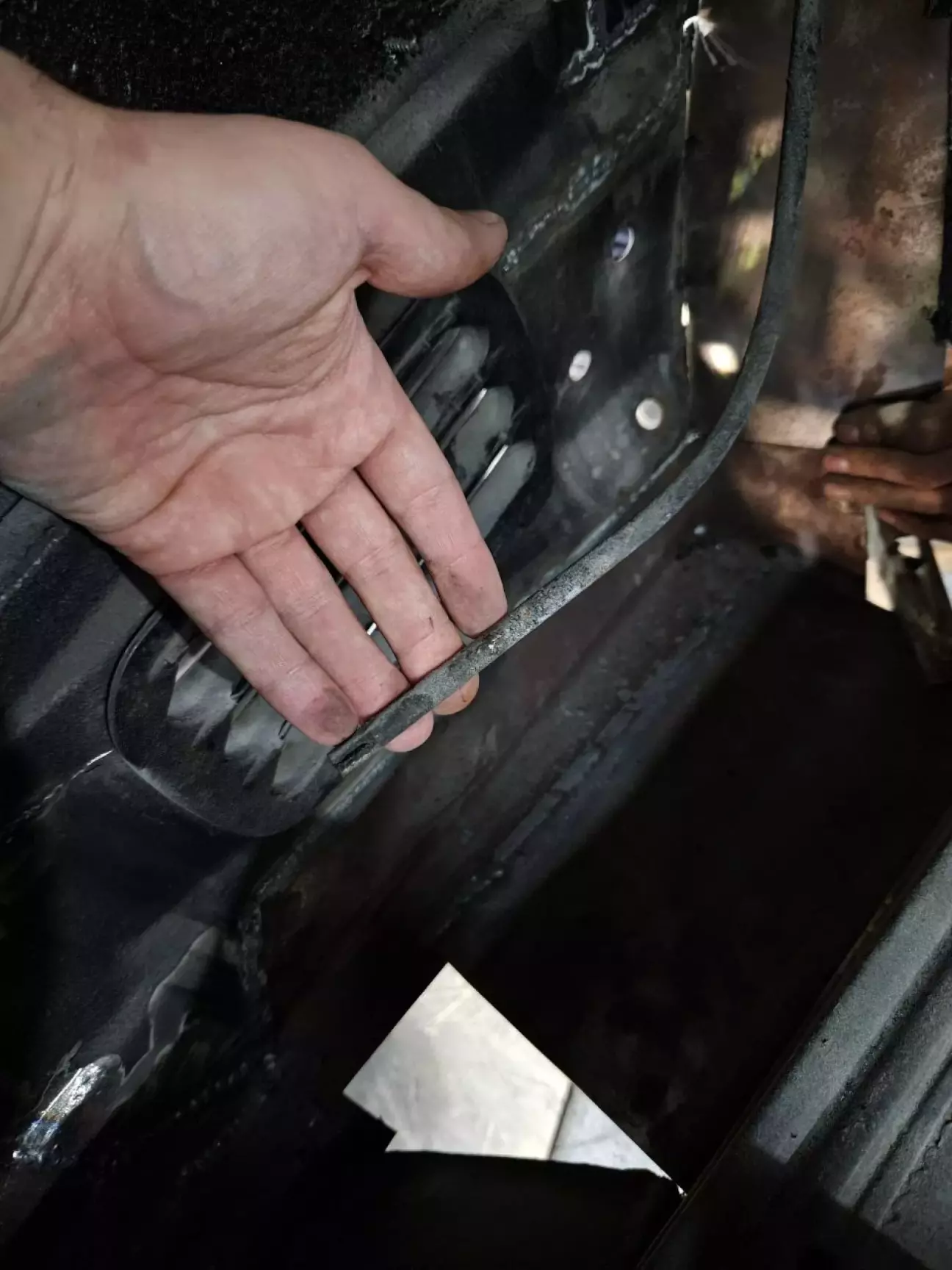 Спочатку я подумав, що це якесь заземлення. Але потім придивися, що ця тема підіймається догори. "Ага, мабуть, воно якось пов'язано із люком", - промайнуло у моїй голові. Так воно і виявилось: коли я зателефонував своєму другу, який знає усе про 124ті та скинув фото, він одразу сказав, що це направляюча люка, і щоб ми її не чіпали. Ок. Зрозумів. Не будемо чіпати. Лише зачистимо від іржі та пофарбуємо. Бо виглядає вона геть погано.