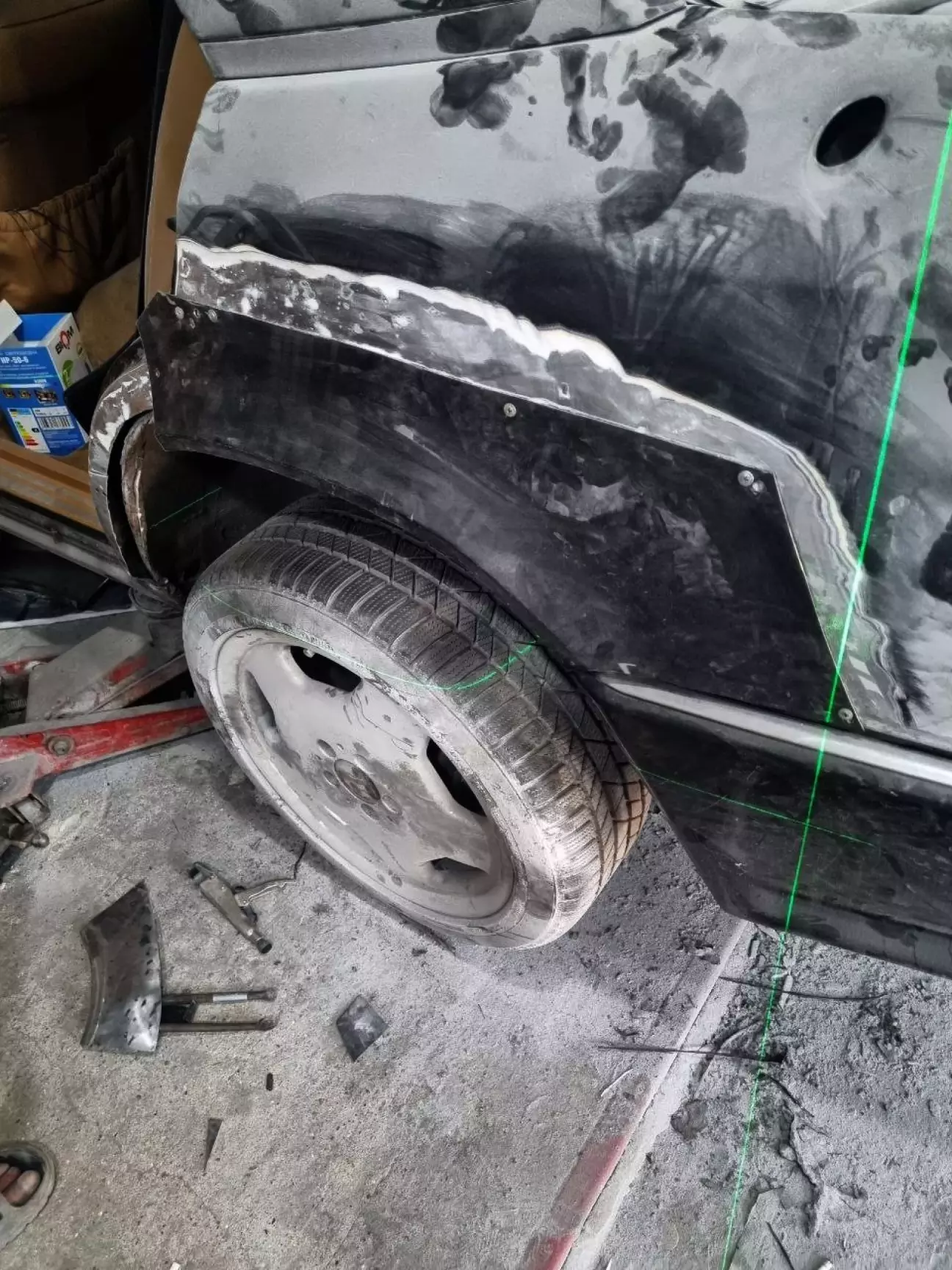 "Кліренс" колеса по відношенню до арок, якщо рівнятись по центральній їх частні, наче відрізняється. Андрюха, а ну неси сюди лінійку. Міряємо. Дійсно так воно і є - різниця у 14 мм (з пасажирського боку кліренс більше, ніж з водійського). А ми домовлялись, що допустима максммальна "дельта" - це 5 мм. Андрюха перекатує машину на більш рівну частину боксу. Повторні заміри. Різниця знижується до 6 мм. Ну, це вже відносно норм. З урахуванням того, що пружини у мене порізані, плюс, з одного боку на машині вже є "шпатля", тож, мабуть, усе ок. Андрій каже, що по факту тре буде ще переміряти усе, коли салон та ніши багажника зберуть, але усе має бути гуд. Ну і добре. Йдемо далі.