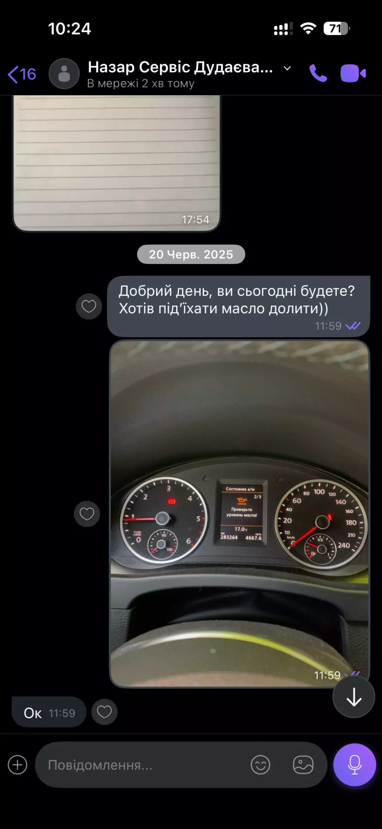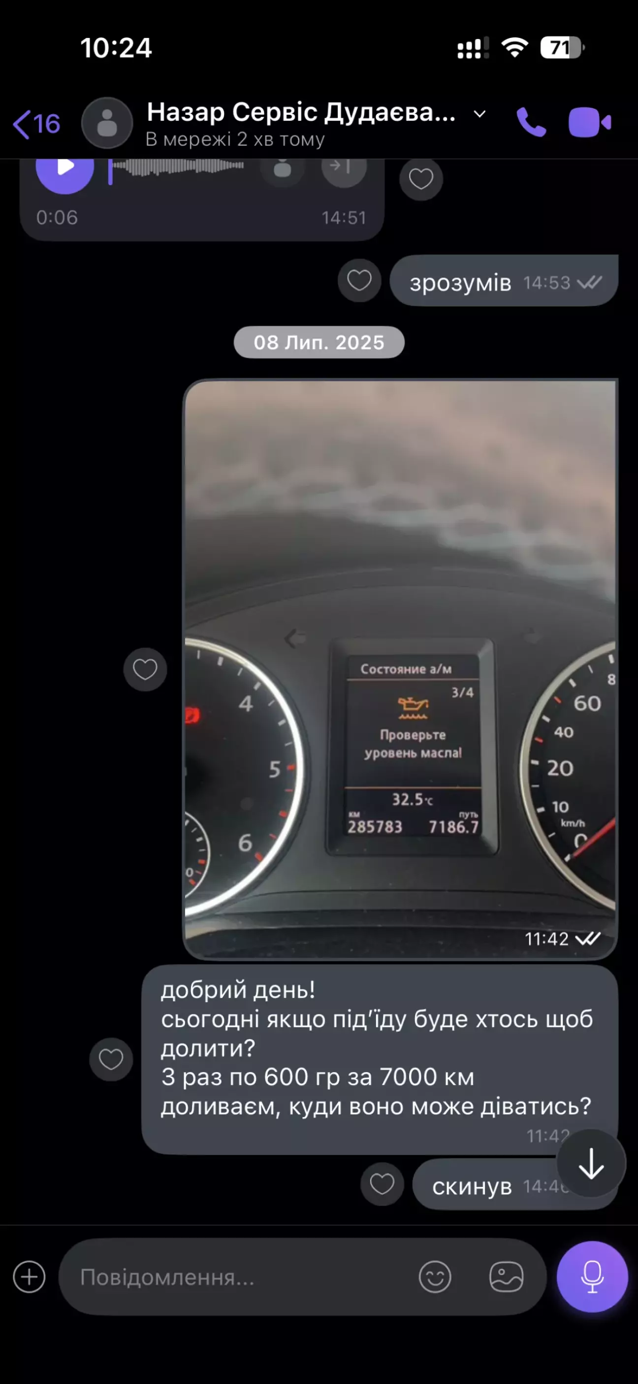 Перші 2500 їздив обережно, незважаючи на слова майстра що можна їздити як раніше 130+ , проте після 110 і більше 2.500 обертів - помітив що вібрація була лякливо великою.. більше і не розганявся. Думаю подушки міняли, еластичну муфту на кардані міняли, масло в двигуні, коробці міняли, колінвал новий.. Проїздив після заміни масла всього 2500 км, чому так? Бо після 2500 мені написало «Перевірте рівень масло» і тут я впав, якого чорта.. Скидую фото Назару, кажу десь масло ділось, каже та двигун притерається ще, заїжджайте - долиємо, думаю ок. Їду до нього, дивимось рівень, менше середини, доливаємо до рівня - 700 грам, охуіти, як так??? 2500 км тому була повна заміна, їзда була зовсім не агресивна, як так притерається??
