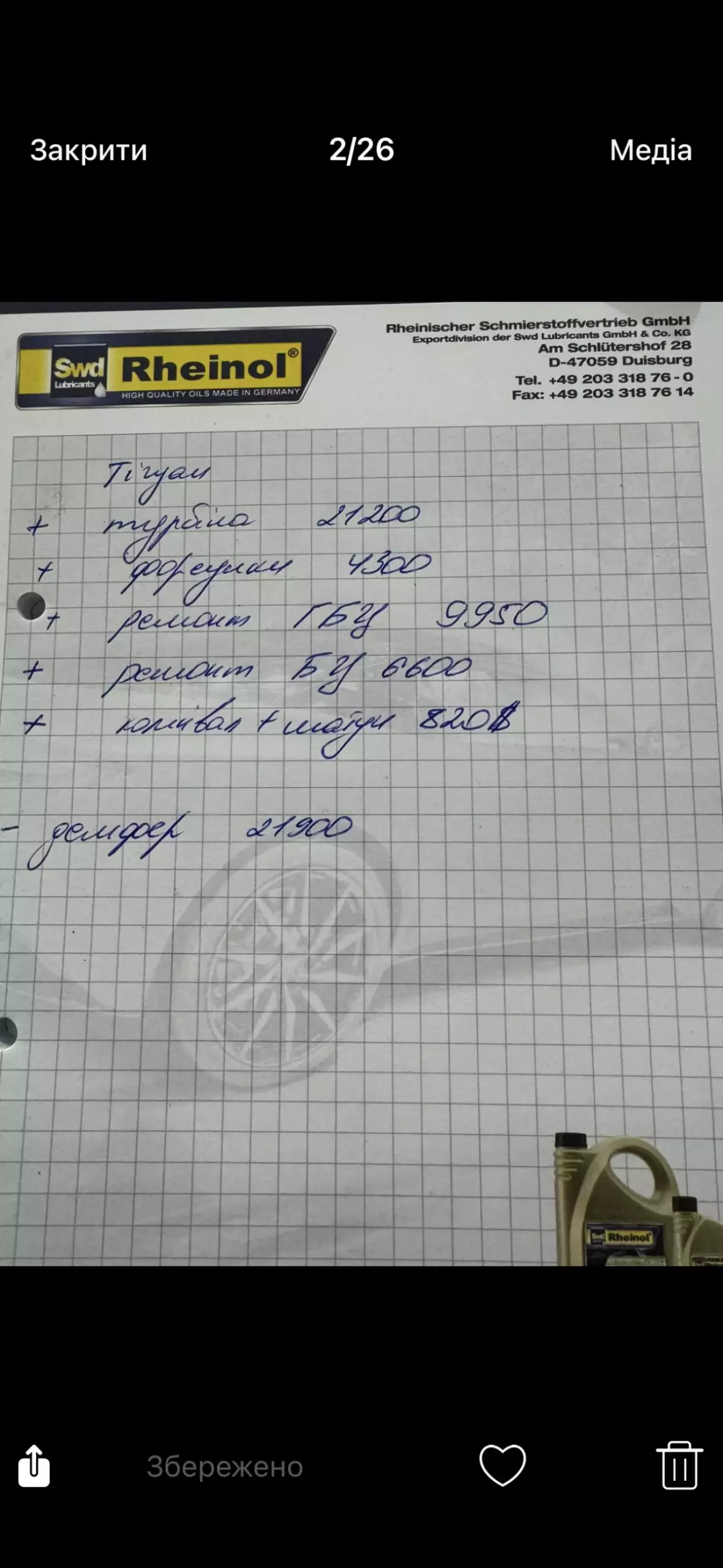 На наступному тижні приїхав, каже Назар, що трохи з того сальника колінвала підтікало і з турбіни.. А от тут стоп, турбіна реставрація 22000 грн… Вал міняли, а я йому казав після капітали, що щось свистить, як набираєш швидкість, а він каже то ви прислуховуєтесь вже, а виявляється то турбіна свистіла, вони її там переуплотнили, перевірили на стенді і поставили назад, зараз наче не тече. Турбіну робили на Набережній здається