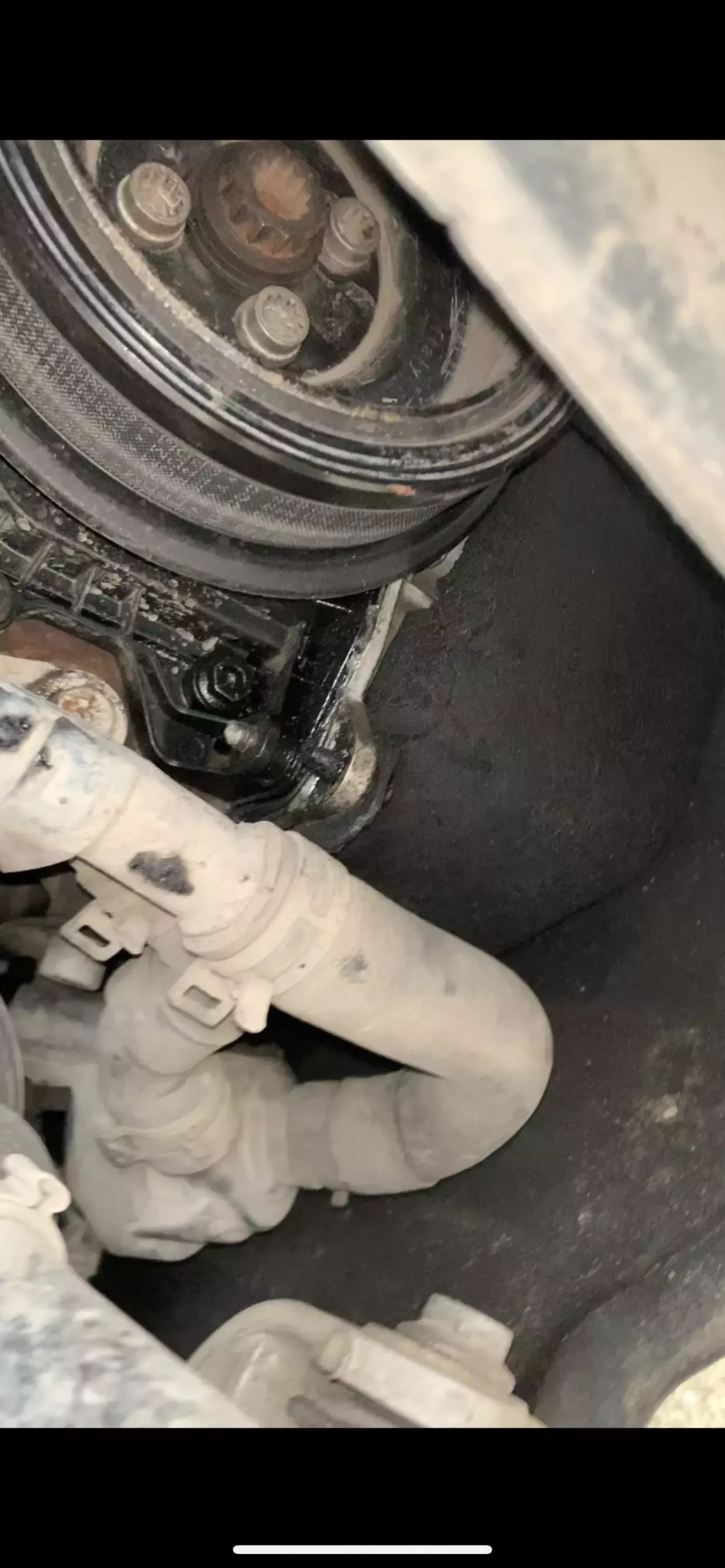 Каже мені, треба підняти глянути машину - піднімаємо і бачимо таку картину, тут я охуів, тіпи роблять капіталку за 6.000 бачей і навіть не умудряються замити двигун, ну нахуй і так знизу ніхто не побаче так? А ще вилазить, що нижню опору двигуна хуйово запресували.. А ще почало щось знов тарахтіти, а це виявляється відремонтований компресор кондиціонера, той новий ремкомплект, шків з пластиною, її знов зірвало, чого? систему ж промили. Я просто в ахуї. Дивіться фото: