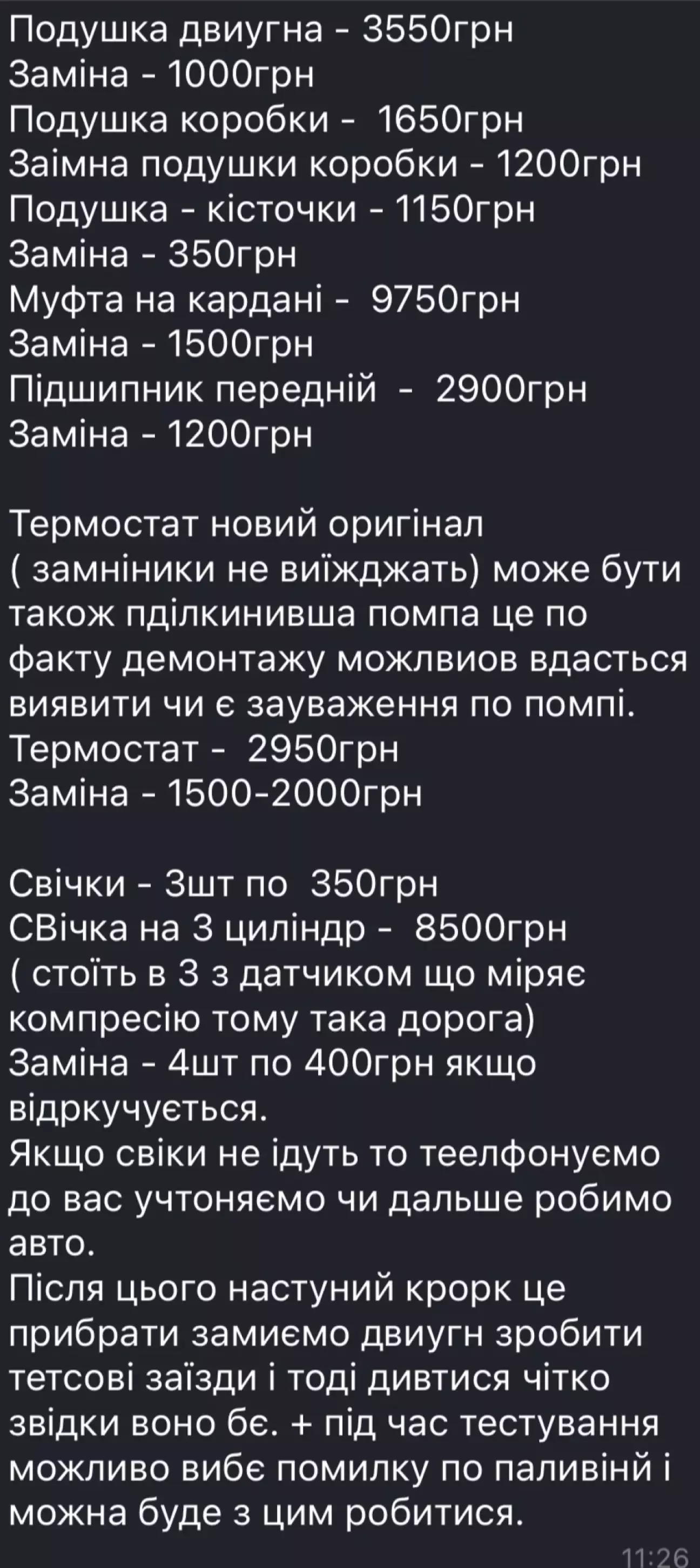 Ці роботи раніше не були узгоджені.Просто людина взяла і поміняла подушки двигуна на 10.000 грн, сайлент рейки 4800.. еластична муфта, при тому що замінена була тільки одна, передня, без мого відома… Задня лишилась потріскана. Після цих махінацій я почав записувати розмови з людиною, та відео з реєстратора.. Так як довіри до нього нема. З горем пополам я забрав машину через майже 4 місяці і лишив в сервісі кругленьку суму, близько 6000 $