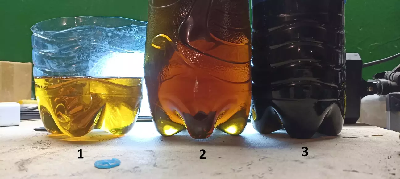 Порівняння масла. 1 - нове масло . 3 - масло яке злив (40000 км і 5 рокі) чорне, але без осаду , без стружки . 2 - масло яке зливав з коробки для восстановлена рівня ( тобто змішане нове і залишки старого масла, яке не зливаєтеся) Тому краще заливати всі 6 літрів нового масла щоб більше розмішати не зливний залишок старого масла.