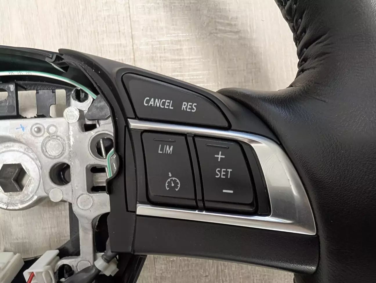 Вмикання/вимикання лімітера відбувається кнопкою вмикання круїзу, натомість круїз вмикається/вимикається кнопкою вимикання/вимикання круїзу. Захотів, щоб кнопки були як положено: лімітер «LIM» , круіз своєю кнопкою. Тому придбав кнопки керування мультимедія/круїзом від авто з відповідною комплектацією. Кнопки виявилися з срібними вставками, що виглядають, як на мене, значно краще. Отак виглядає цей блок кнопок.