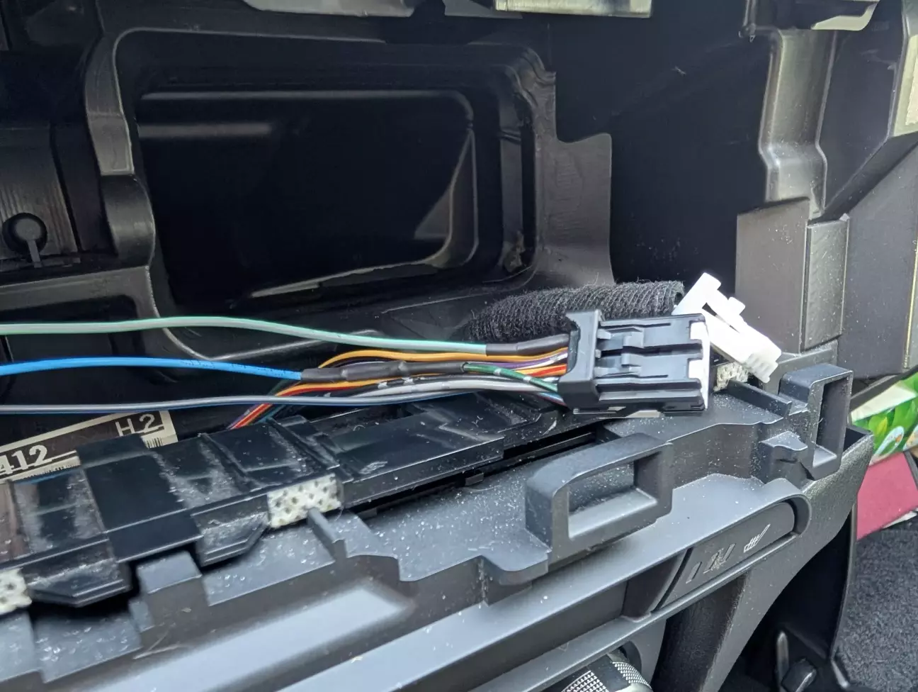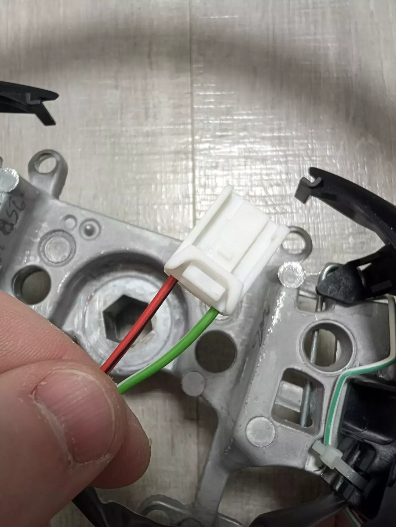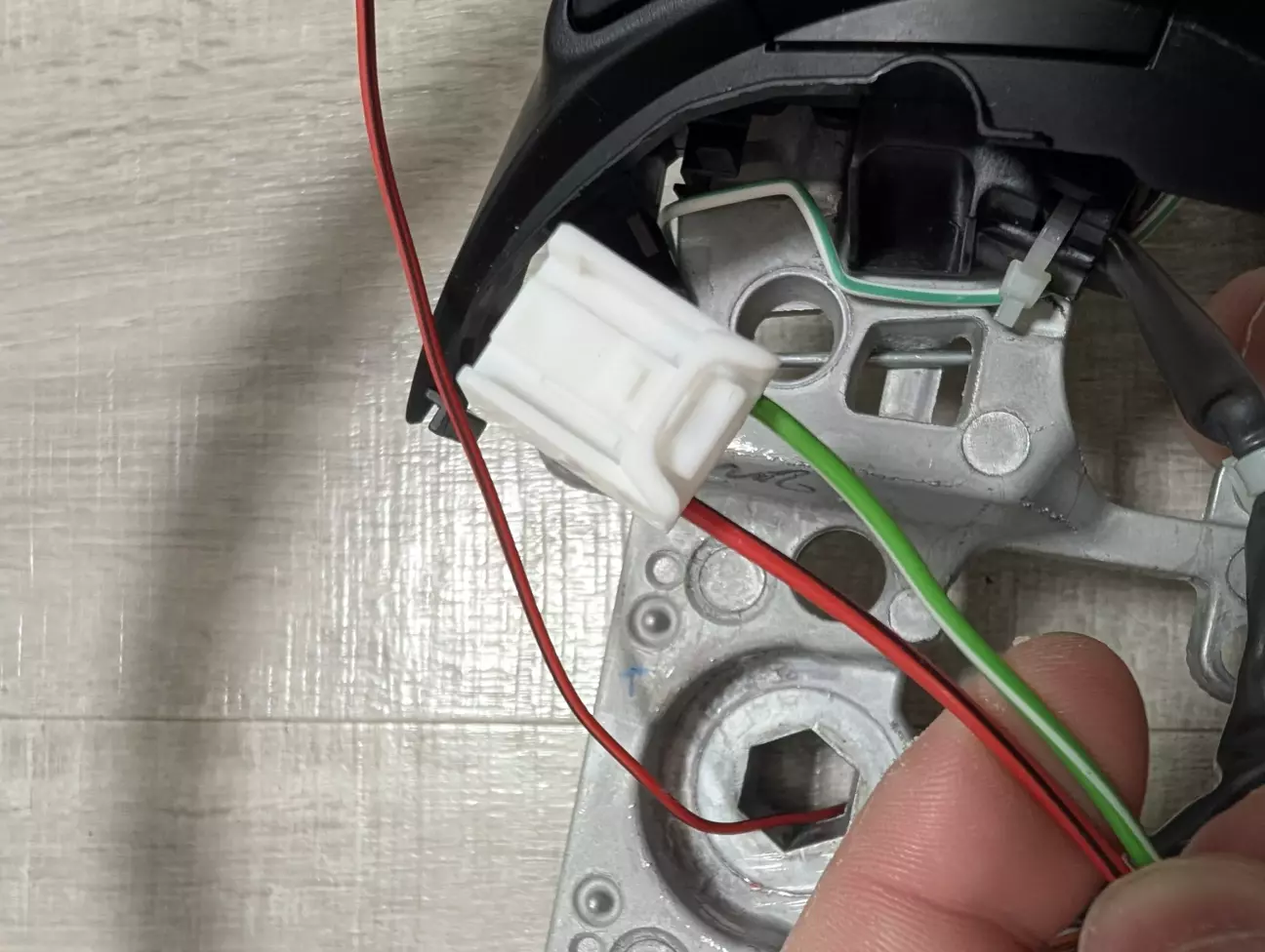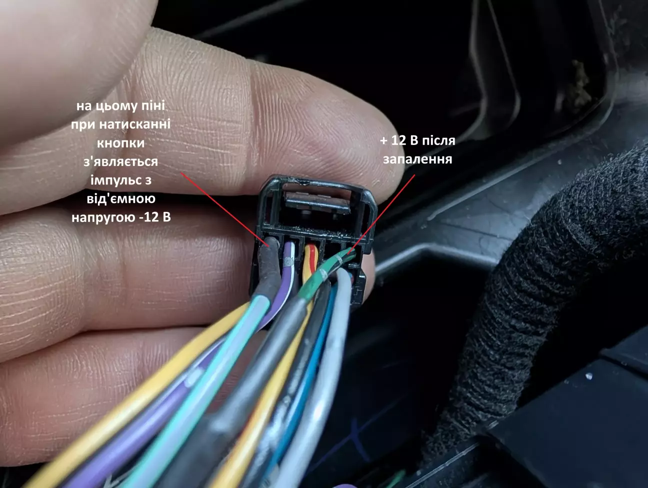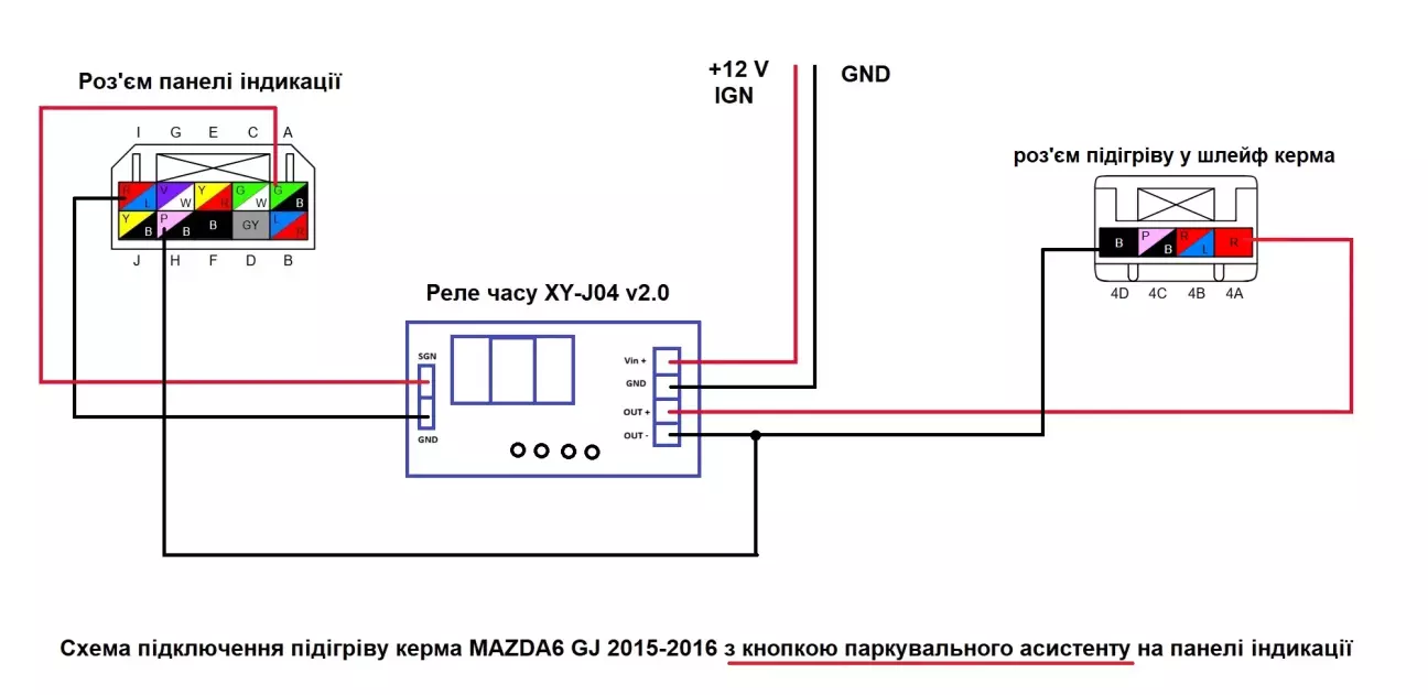Від виходу з реле протягнув живлення по джгуті штатної проводки у кермову колонку до підкермового шлейфу. Кінці проводів обжав у піни, вставив у придбаний роз’єм і під’єднав на вхід «равлика». Також з мінусового виходу реле часу завів провід на діод підсвітки кнопки увімкнення. Таким чином при увімкненні підігріву запалюється індикація на кнопці, при вимкненні підігріву індикація гасне.