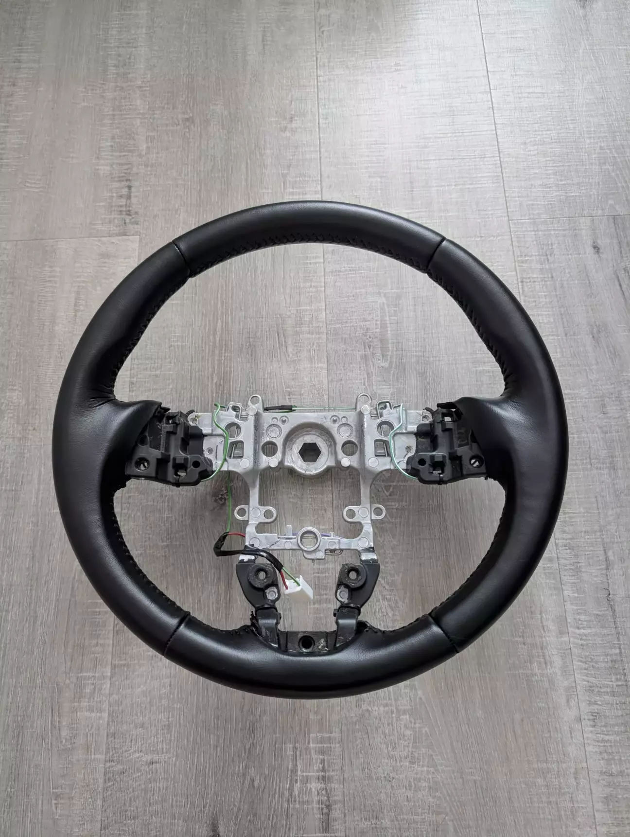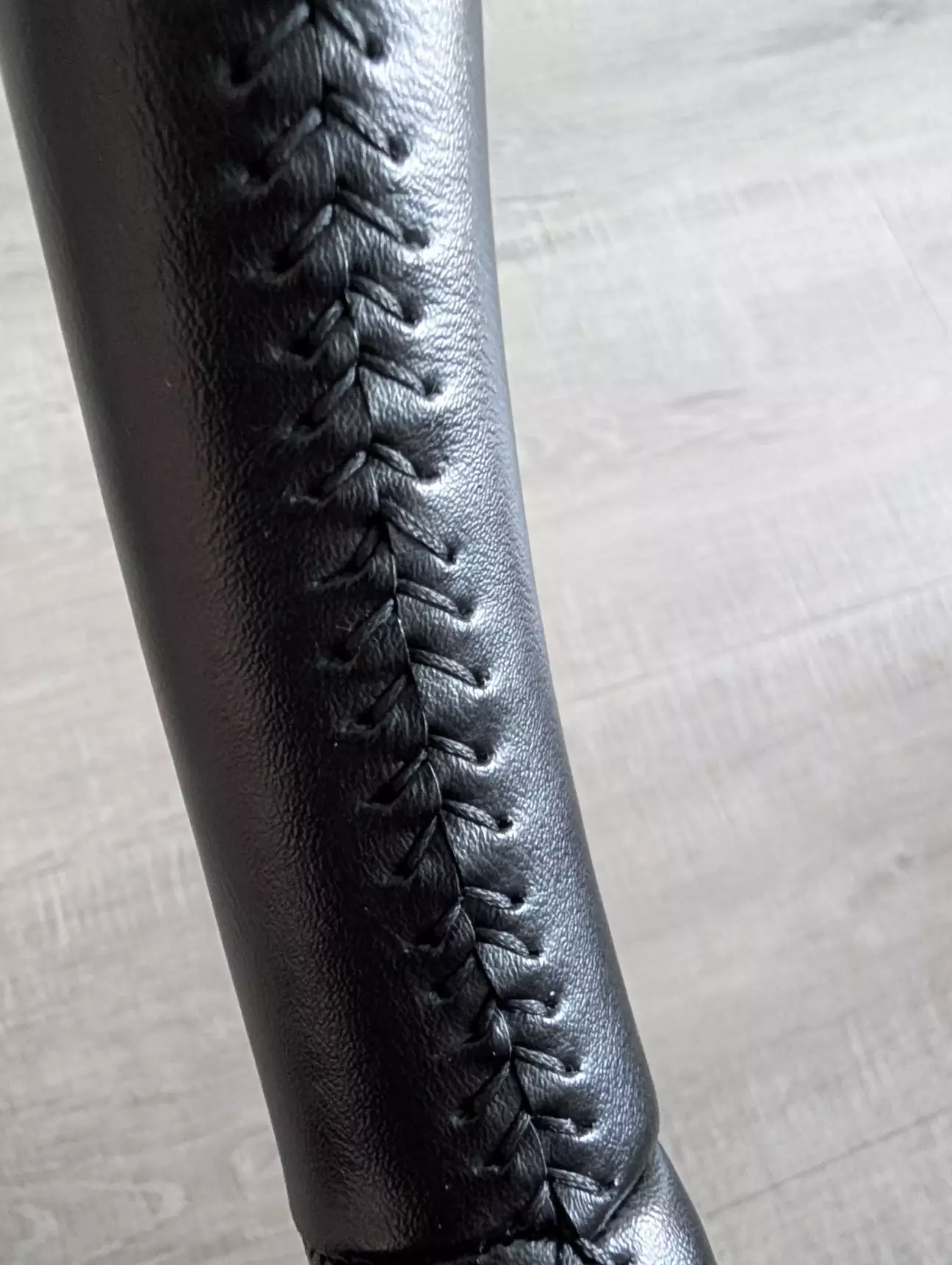Після цього можна було віддавати кермо на перетяжку. Я вирішив перетягнути кермо самостійно і почав шукати хто робить готові викройки для перетяжки. Із шкіри я не знайшов (певно погано шукав) але знайшов людину яка робить викрійки з еко-шкіри. Ціна була 550 грн за набір. Вирішив брати її, тим більше що досвіду перетяжки не мав і запартачити шкіряну викройку було б дуже шкода… До того ж я не знав як все буде працювати і чи не прийдеться потім щось переробляти. Викройку просив зробити не прошиту по краю, бо хотів зробити шов як у оригіналі «ялинкою». Майстер рекомендував не робити отвори заздалегідь, бо при обтягуванні отвори можуть не співпасти один навпроти одного і «ялинка» не вийде. Тому шнурував, пробиваючи отвори голками, намагався зберігати однаковий крок. В основному вийшло добре, але кілька косяків таки зробив. Їх візуально не видно, бо ці місця у верхній частині керма і скриті від погляду )). Вийшло якось так..