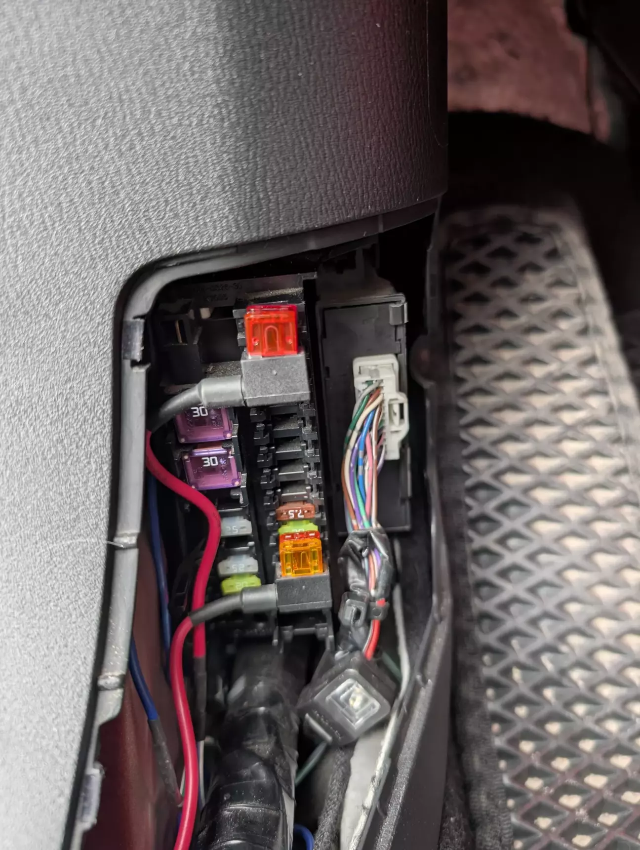 Тепер можна приступати до підключення і налаштування. Для живлення використовував проводи перетином 1мм2. Плюс взяв у блокові запобіжників в ногах водія в незадіяному роз’ємі, а мінус з болта біля блоку запобіжників.