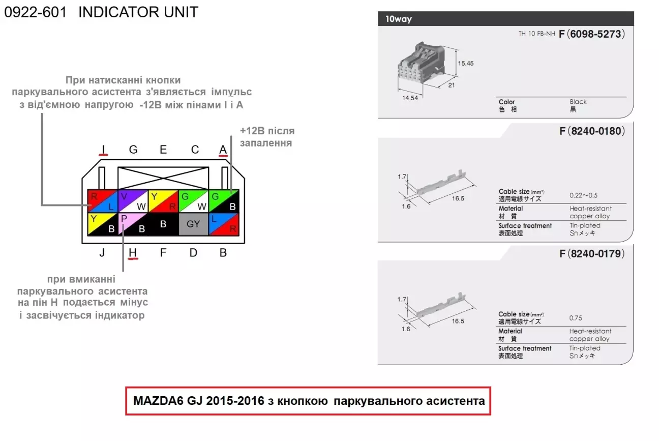 Воно побудоване на транзисторах без фізичних реле на платі, тому не клацає при вмиканні. Працює з напругою від +5В до +36 В, керування вмиканням/вимиканням відбувається подачею імпульсу від +3В до +24В. Але ж у мене з кнопки від’ємний імпульс. Чи буде працювати? Крім як придбати і перевірити варіанту немає. Отримав реле, намалював схему підключення, підібрав 2 шт підходящих пінів (SUMITOMO 8240-0180 або 8240-0179) для роз’єму кнопки вмикання і пішов у авто тестувати.