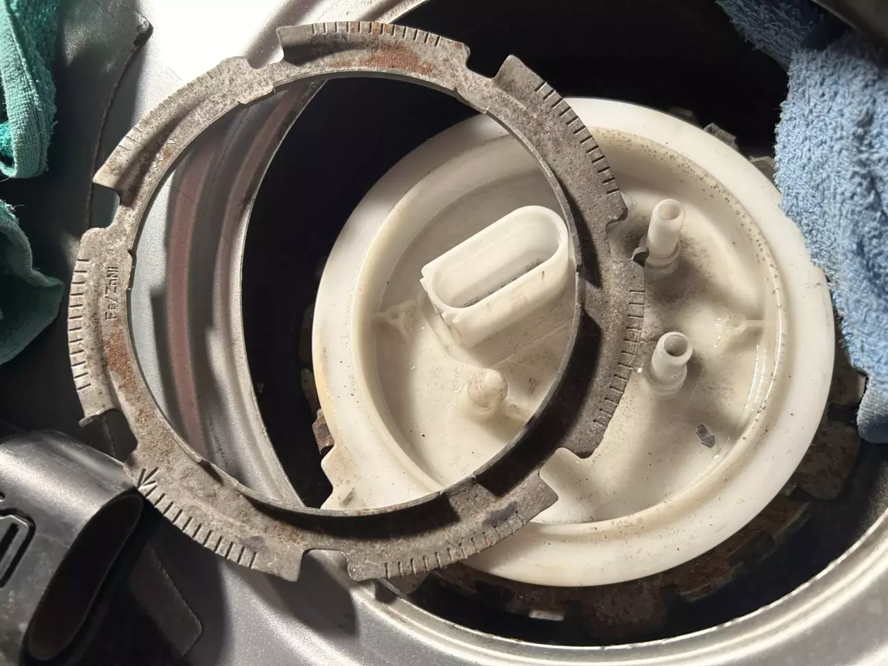 Верхня частина бензонасоса піднімається нагору за рахунок пружини в конструкції. Ця ж пружина притискає нижню частину бензонасосу до дна при встановленні. Акуратно піднімаємо насос і починаємо його виймати. У мене бак був майже повним, і це трохи завдало незручностей. Умовно. Коли нижня частина насоса /колба/ починає виходити з бака, в ньому ще залишається поплавок на своєму коромислі. І в цей момент, бензонасос треба нахилити в бік поплавка, щоб все акуратно дістати. А колба при цьому сповнена бензином. Нічого страшного при цьому немає. Акуратно нахиляємо насос і зливаємо бензин із колби в бак. Якщо все робити акуратно і не поспішаючи, то все в нас вийде добре, як у мене. Швидше за все, якщо у вас буде пустий бак, це буде зручніше.