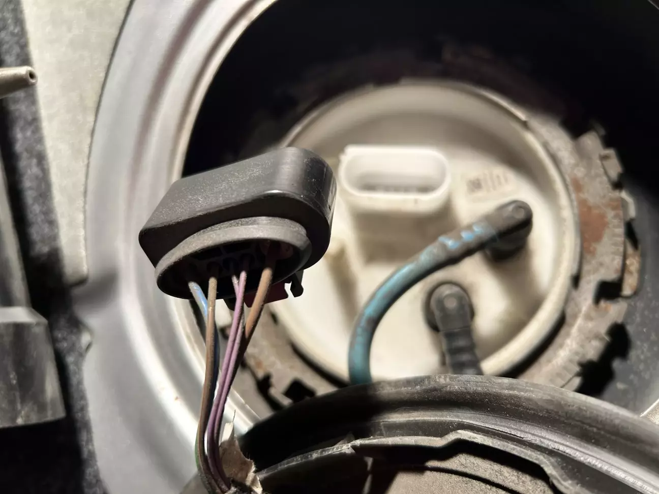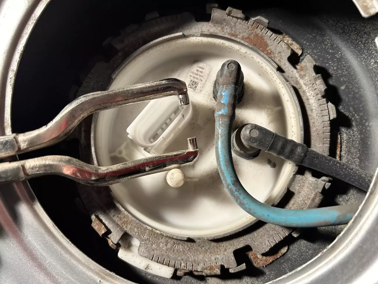 Як видно, тут все просто: фішка з дротами та два бензопроводи з кліпсами. Знімаємо фішку. За допомогою інструменту натискаємо фіксатори на кліпсах і знімаємо їх зі штуцерів бензонасоса.