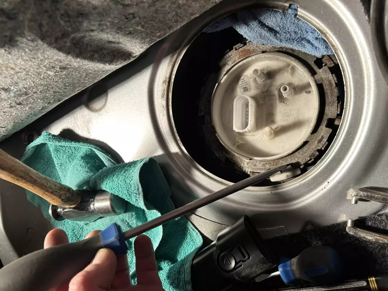 За допомогою викрутки і мотолка, зсуваємо пластину, що фіксує бензонасос у своєму посадковому місці в баку.