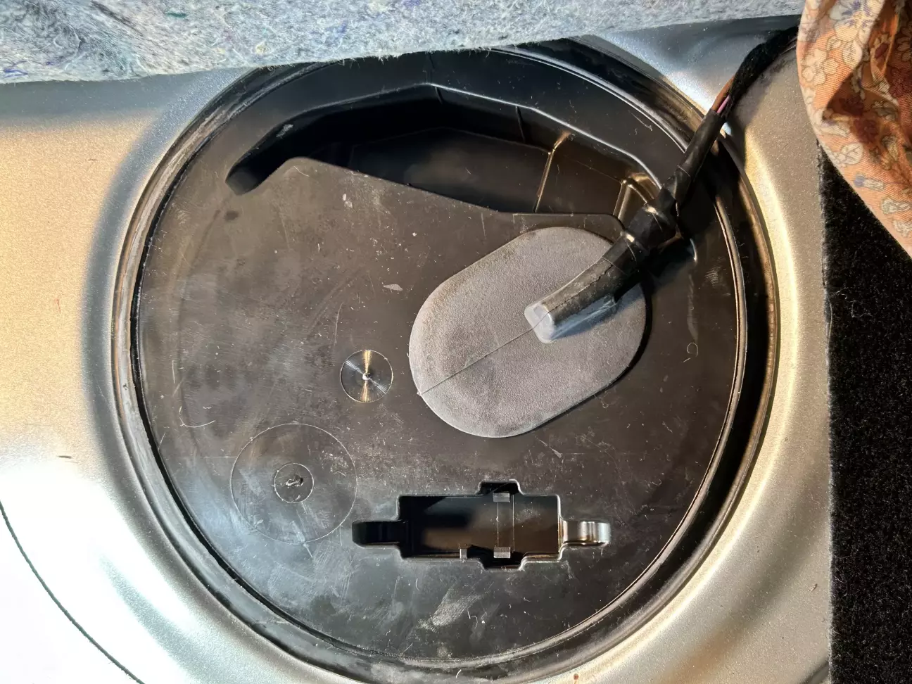 Підняв сидіння /вперше за 18 років/. Прибрав мінімальне сміття. Підняв ворсову прокладку, зафіксував її, і ось кришка, під якою ми отримуємо доступ до бензонасосу.