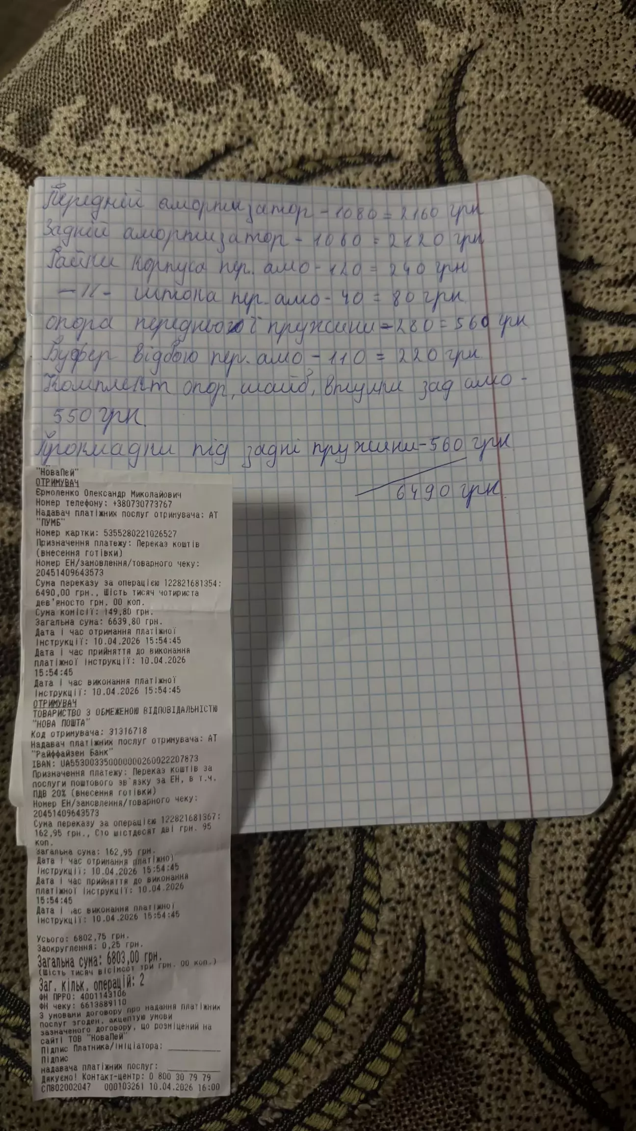 Ці запчастини придбав у Олександра taradaika. Комплект амортизаторів з супутніми запчастинами перед-зад обійшовся з послугами нп - 6803грн