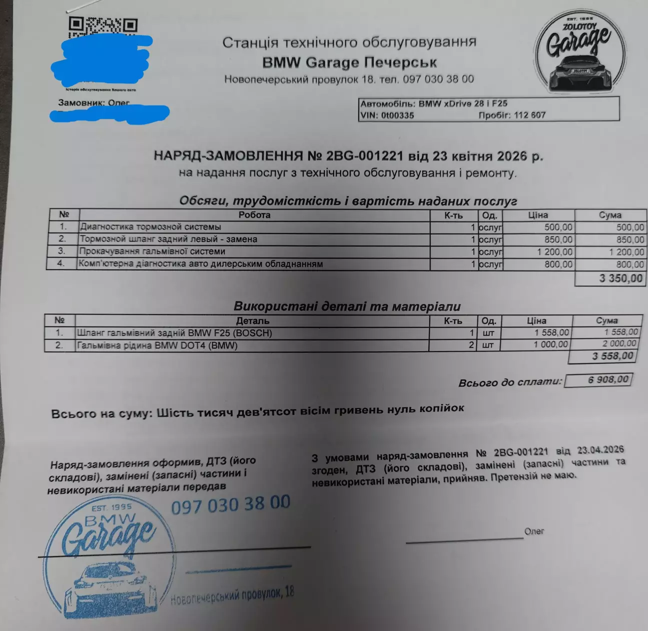 Акт і ціни. Недешевий квест шланг влаштував, звісно. Лише гальмівної на повне прокачування через DSC пішло 1.8л (за словами менеджера - я того не бачив). Залишок у пляшці мені віддали.