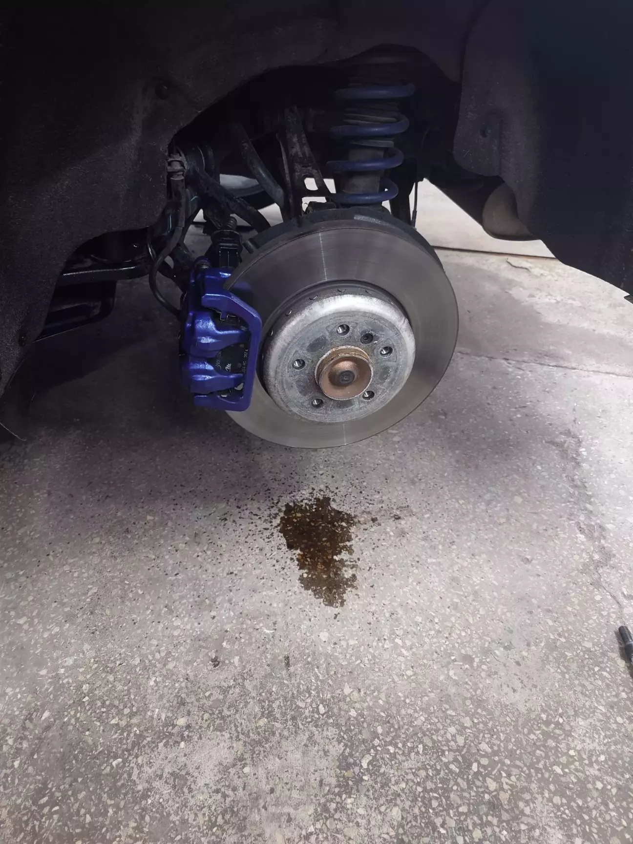 Оце така калюжа натекла уже у боксі десь хвилин за 20. Там кілька разів "тестували" ще шляхом натискання на педаль гальм, аби майстри переконалися, що проблема саме у шлангу.