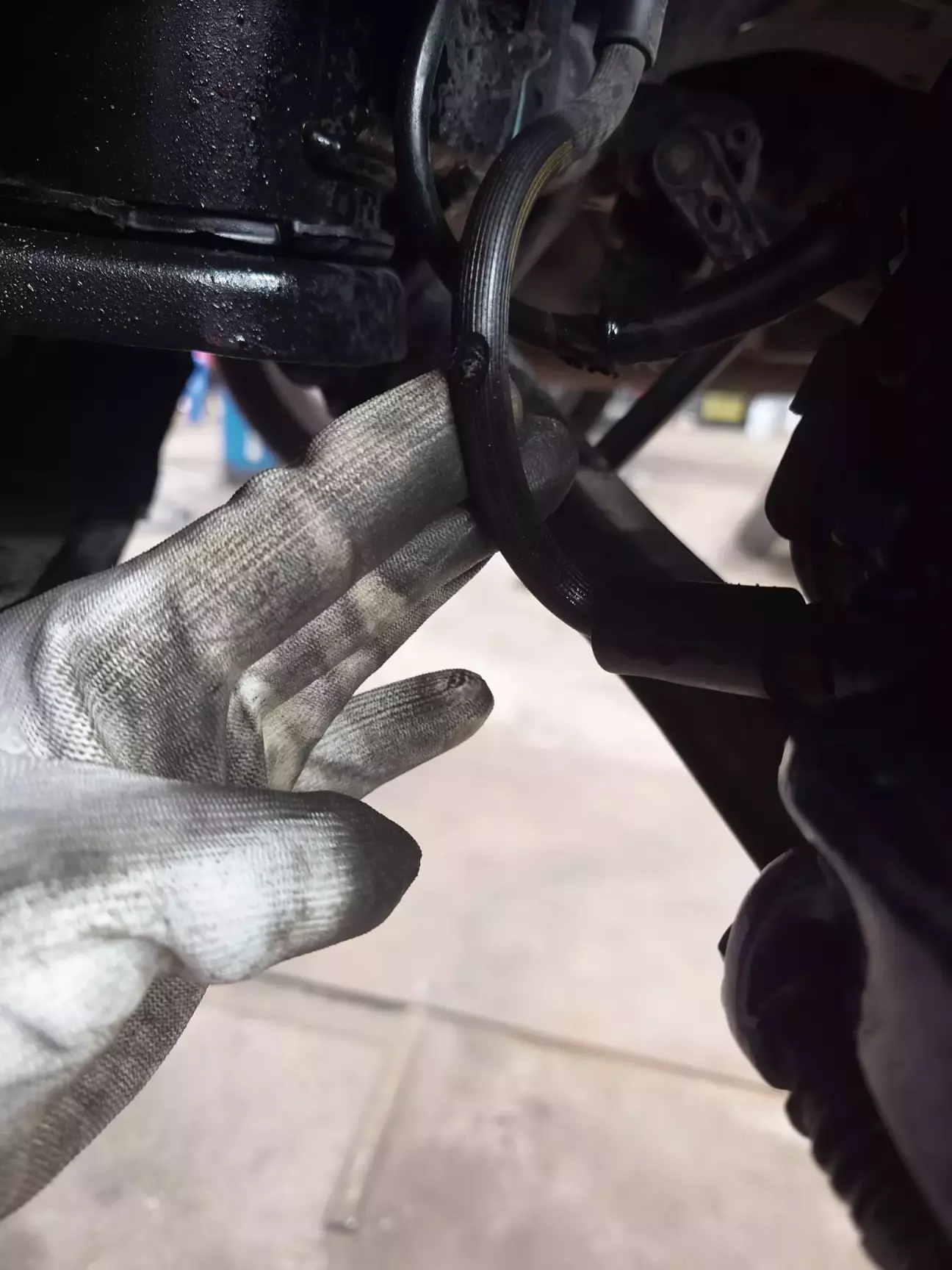 Візуальне підтвердження також є😅 Зовнішній шар шлангу наче розрізаний у одному місці - це у нас джерело витоку. Ще перевірили шланги на інших колесах - там усе ок, ніяких слідів пошкоджень. Тут стає цікаво, чому така проблема виникла і чому лише на одному колесі? Шланги на задніх колесах ніде не закріплені і, фактично, висять у повітрі. Рухаються вони вгору вниз разом із колесом, то ж, скоріш за все, якась частина кузова і є тим різником. І дійсно, якщо провести уявну лінію від місця пошкодження вгору, то побачимо там задню частину підрамника (як я зрозумів).