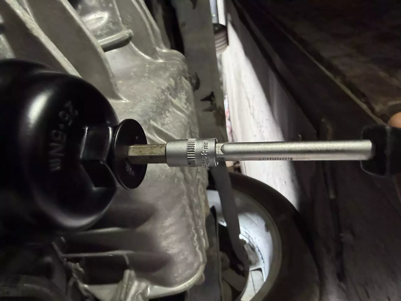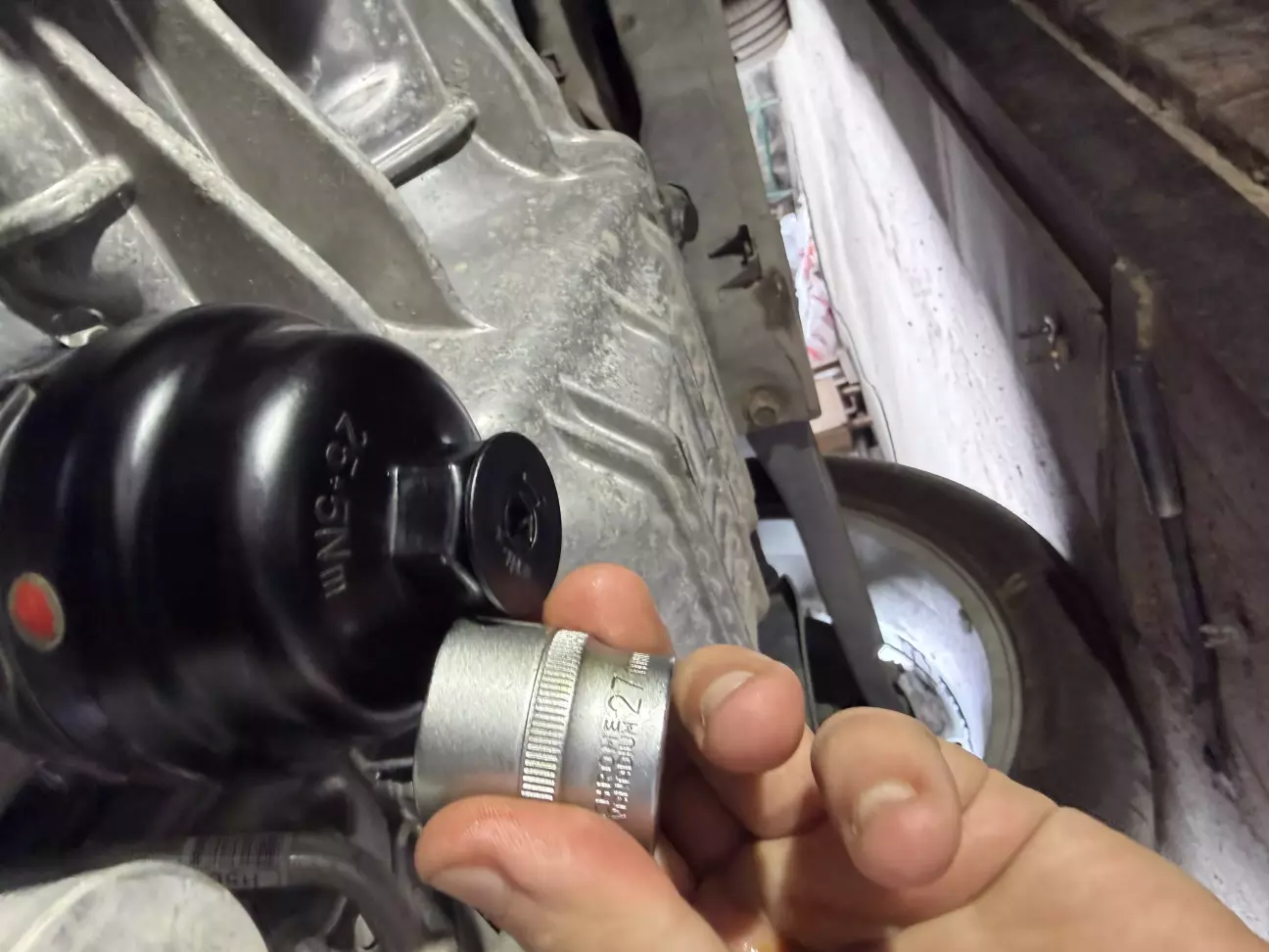 3. Далі відкручуємо невелику пробку у корпусі фільтру щоб злити з нього теж оливу, вийде грам 200 оливи. Для цього нам потрібен шестигранний ключ #8