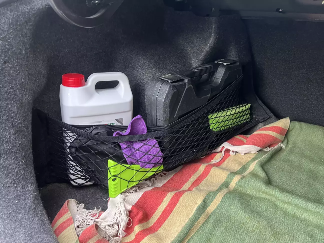 Взяв для тесту 80x25, з'ясувалось що трішки завеликий як на мене, але піде. Потрібно буде докупити ще трішки різних розмірів, щоб відокремити нішу (там де каністра) з 2х боків. Сітка на липучках, до ворсу прилипає досить непогано, втримує навіть набір інструментів Dnipro-M ULTRA (56 шт.), сама сітка подвійна, з карманом, дуже зручно для всяких ганчірок чи подібних дрібниць. Якщо ворсу немає, то думаю можна спробувати приклеїти велкро, його думаю буде достатньо.
