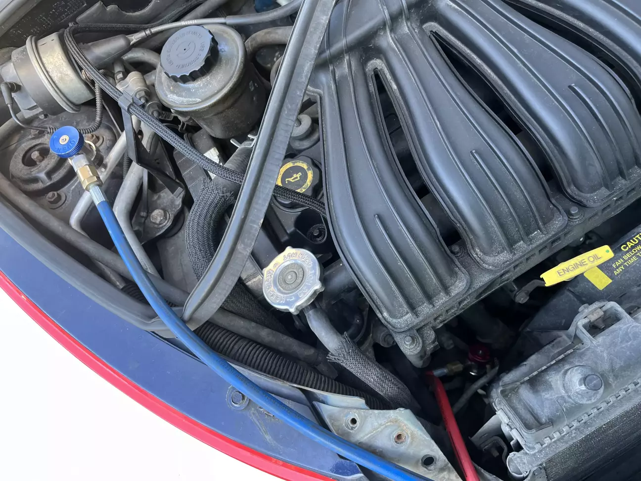 Апарат у нас на сервісі є, але у випадку PT Cruiser перепоною знов став його ретро дизайн, зокрема капот в стилі 30-х років. Впевнений, що саме через нього для доступу до трубки низького тиску (та, що товста) треба зняти решітку (4 саморізи 7мм), поперечку «телевізора» (6 болтів 10мм, 1 болт 12мм) і посунути пакет радіаторів уперед: