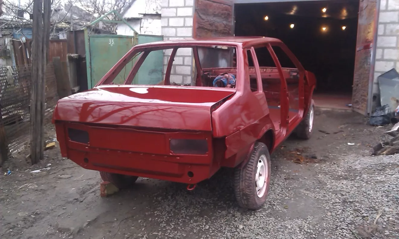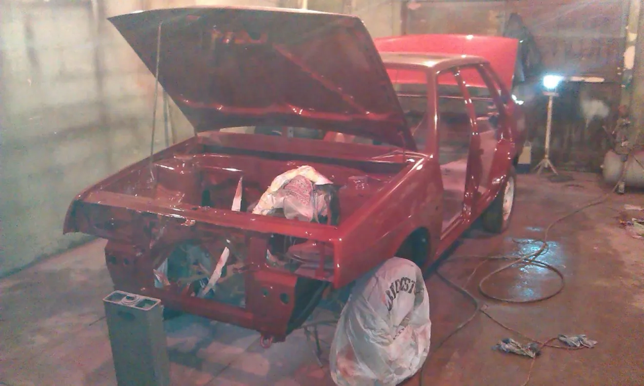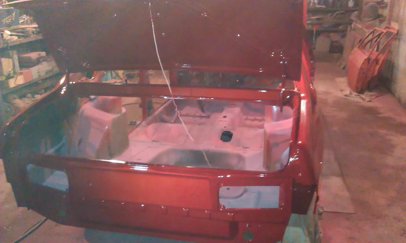 Всем привет.Покрасили машинку мы еще в начале февраля, я уже её собрал и езжу на ней, но настроение что то писать появилось только сейчас.Очень много сил и времени заняла подготовка к покраске, мы с другом просто запарились её тереть, ушло 2 кг шпакла и очень, очень много наждачки.Очень долго не мог определиться с цветом для машины, сначала я хотел облить её в цвет "портвейн", но потом увидел машину в таком цвете грязную и мне перехотелось красить в такой цвет, потом перебрал множество вишнёвых оттенков но тоже ничего не понравилось.В итоге пересмотрев кучу вариантов остановился на цвете "Калифорнийский мак №190".Прикол этого цвета в том, что на солнце он ярко красный, а в тени вишнёвый.Минус этого цвета в том, что при покраске он плохо перекрывается, по этому у нас ушло 3 литра краски.К сожалению фоток мало, так как в процессе просто забывал фотографировать.