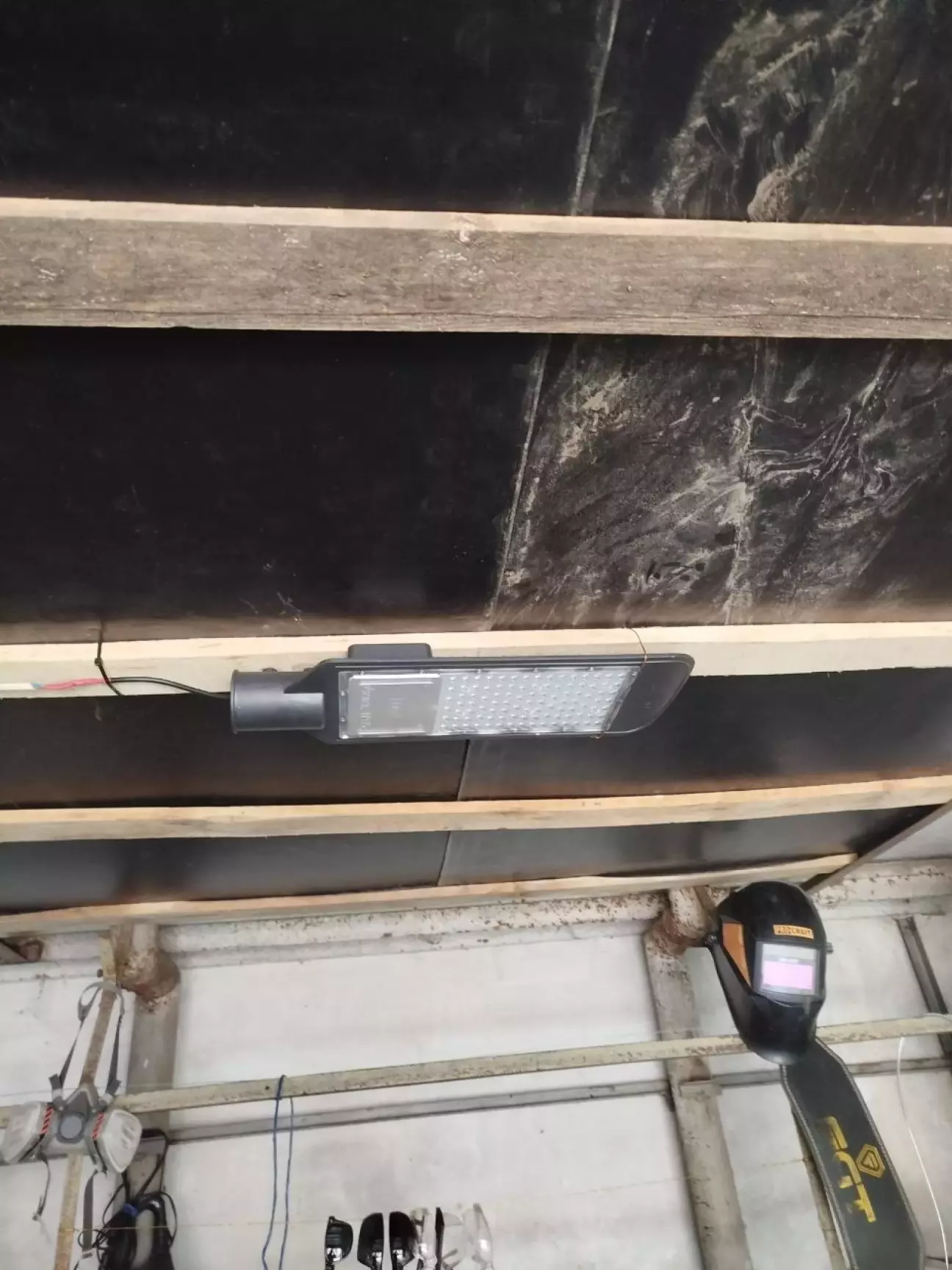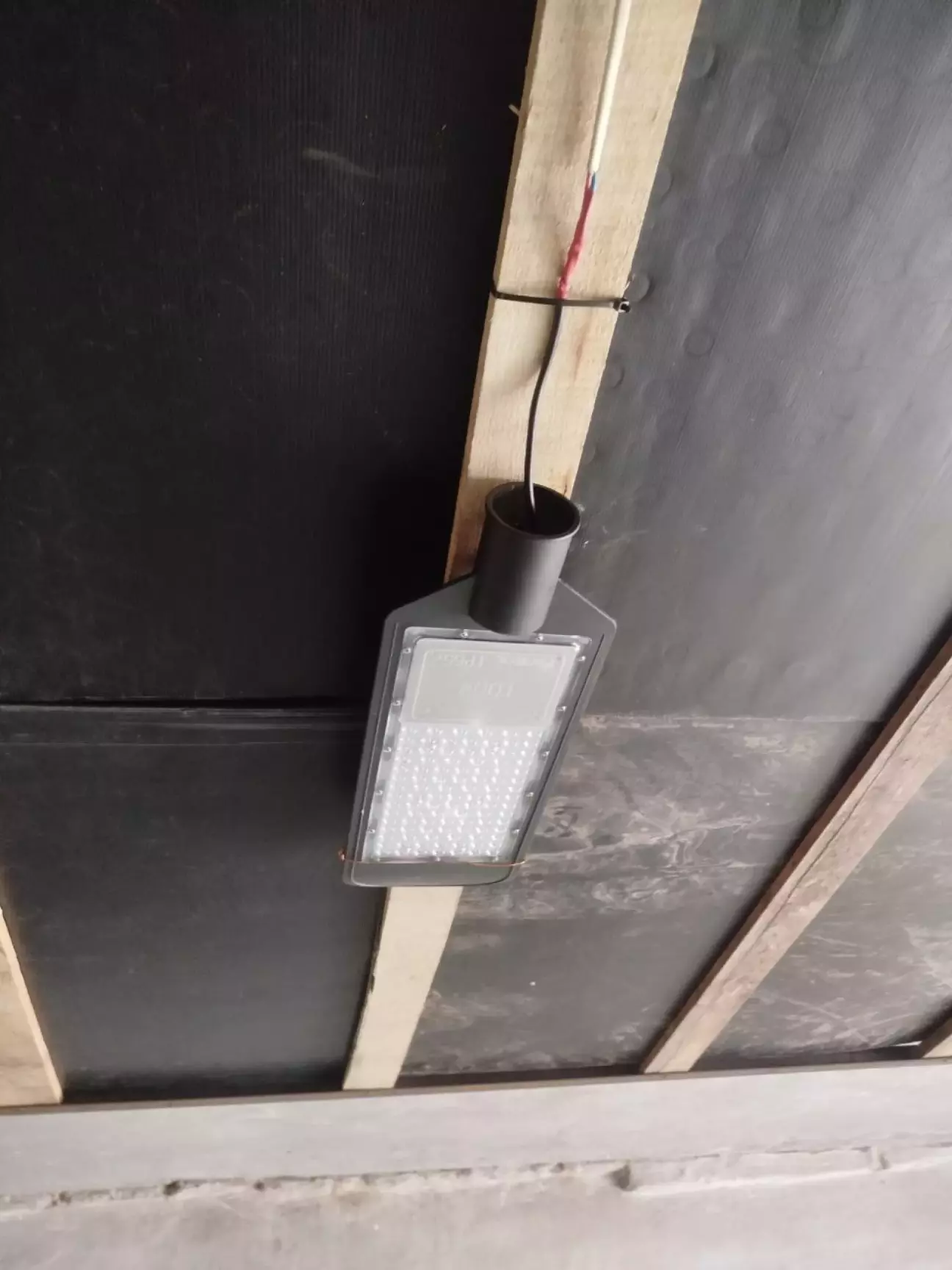 Під час встановлення виникли невеликі труднощі, тож вирішив закріпити прожектор на стелі прямо над капотом авто, щоб під час ремонту більше не користуватися переносною лампою на проводі.