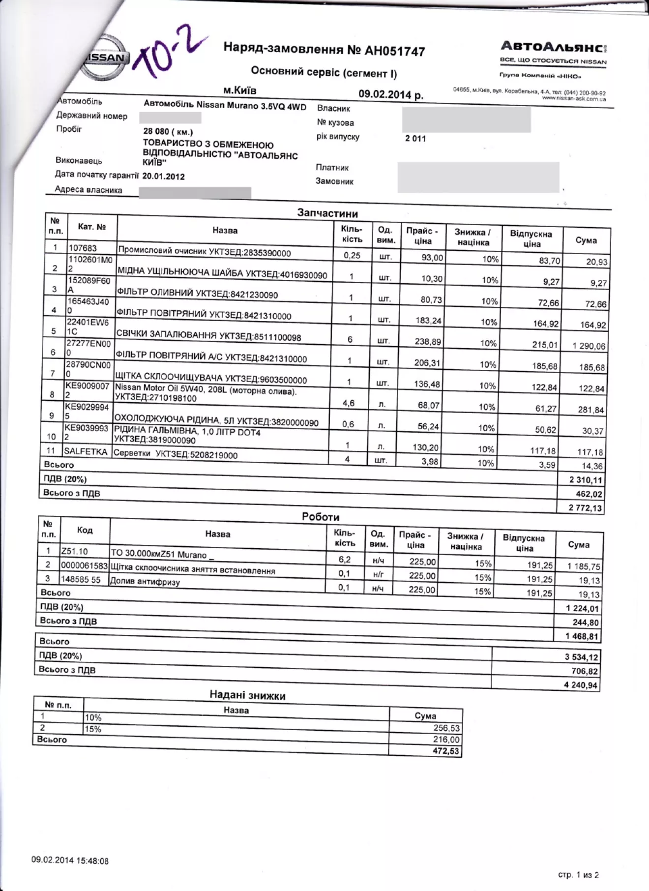 Меняли фильтры, свечи, долили антифриза, поменял еще заднюю щетку стеклоочистителя. Общий счет с учетом скидок 4200 грн.